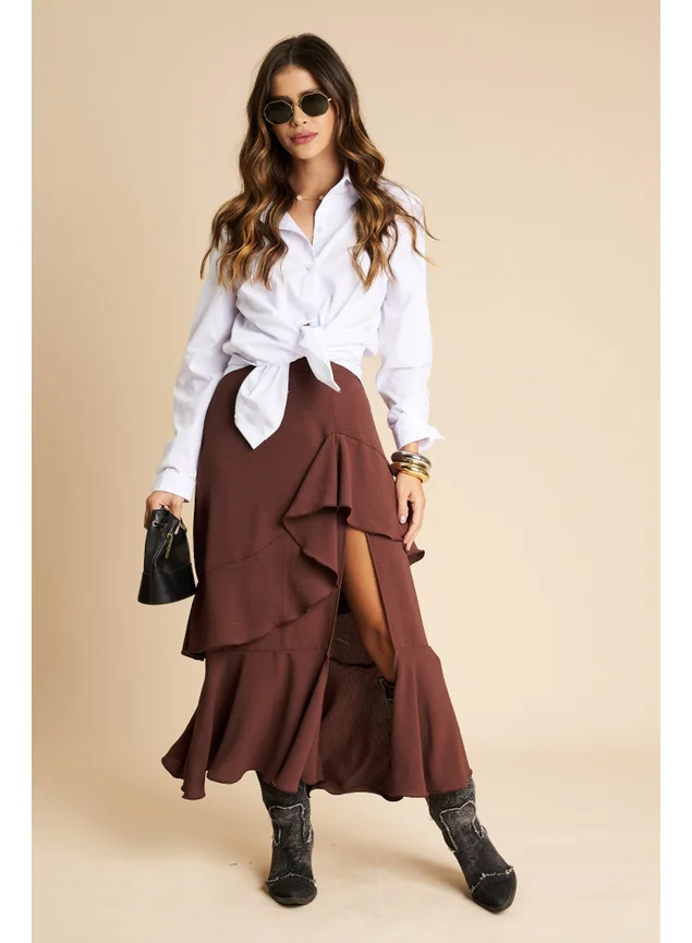Seu comprimento midi é perfeito para diversas ocasiões, desde um passeio casual até um evento mais formal. Combine a Saia Midi Babados Texas com uma blusa cropped ou uma camisa de botão para um look equilibrado e elegante. Com certeza, ela será uma peça-chave no seu guarda-roupa.